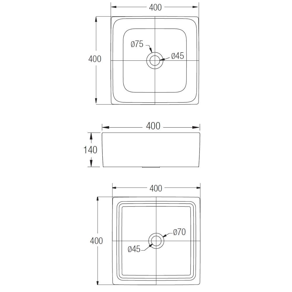Basin Dimension: (L) 400mm x (W) 400mm x (H) 140mm.